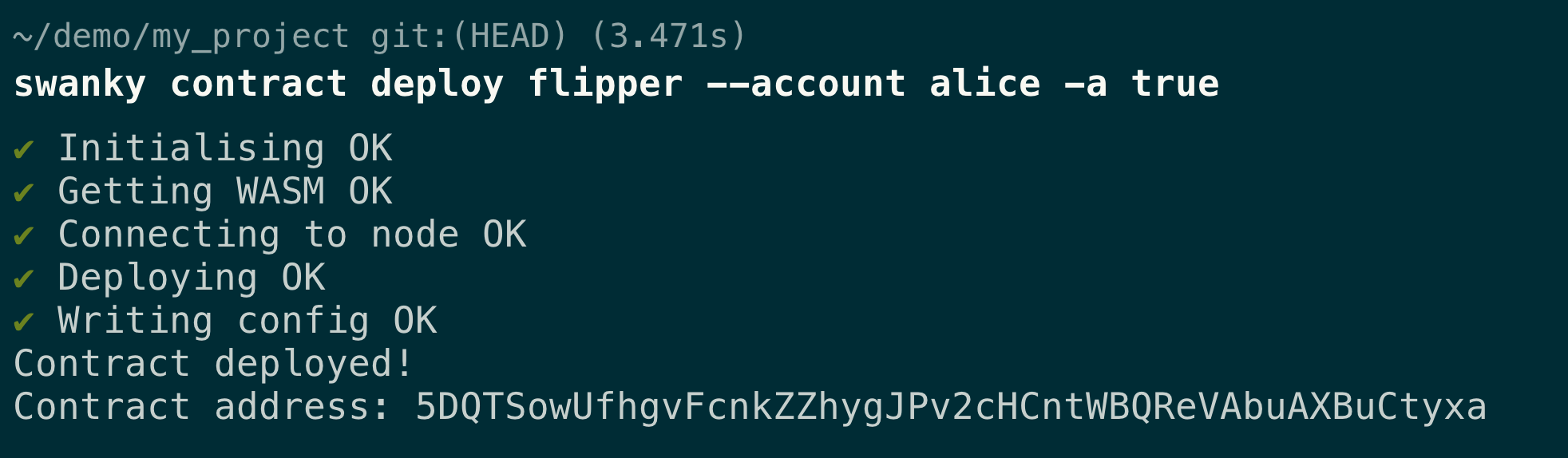 Successfully running the deploy command will print out the address your contract is deployed to, as well as save it into swanky.config.json