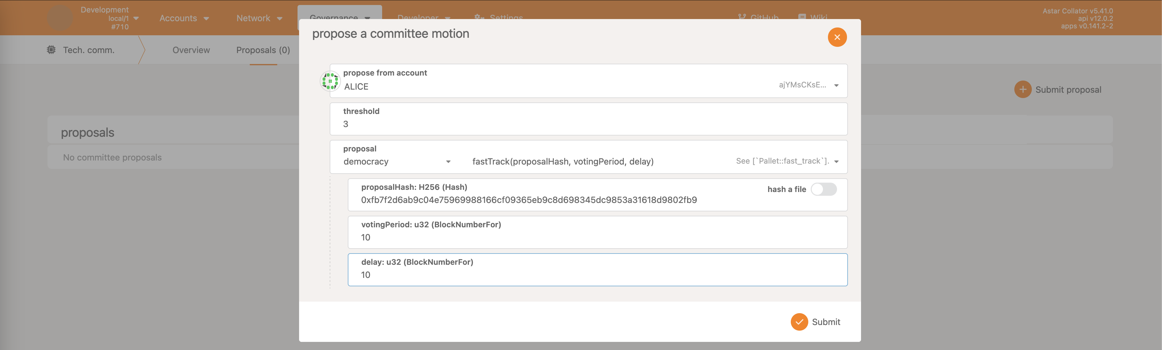 Once the Fast track action is complete, a new motion under the Governance -> Tech. Committee -> Proposals tab is created.