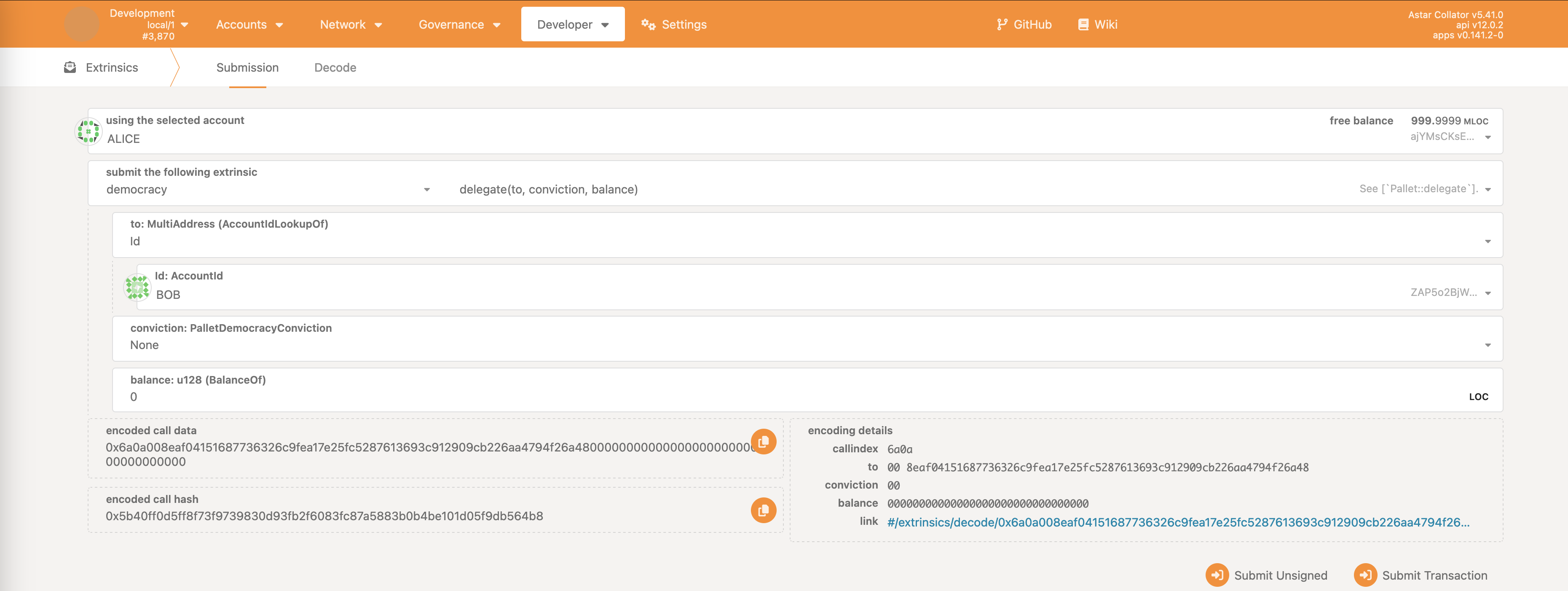 Select Developer -> Extrinsics.