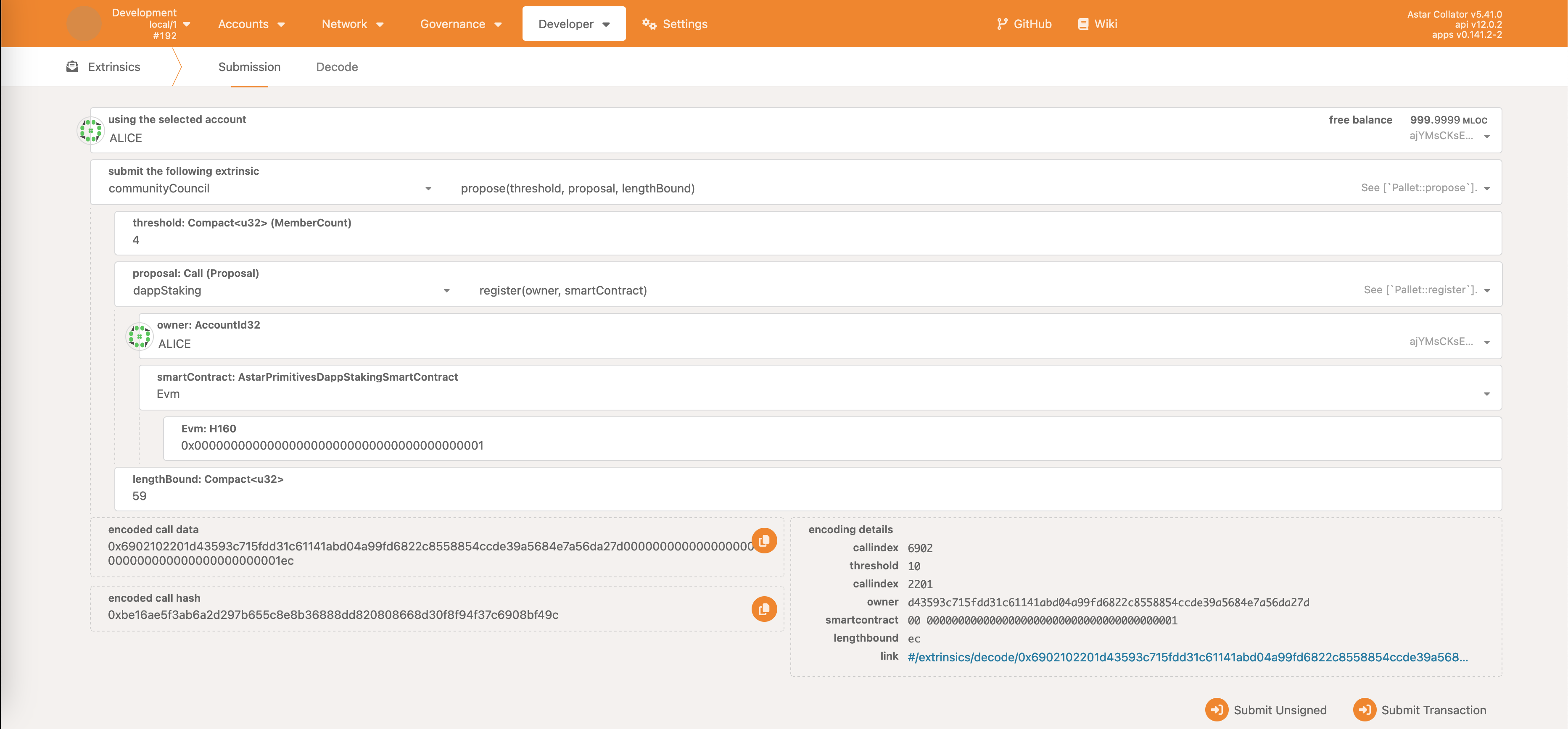 Once the transaction is submitted & executed, the dApp staking register call will be successfully executed.