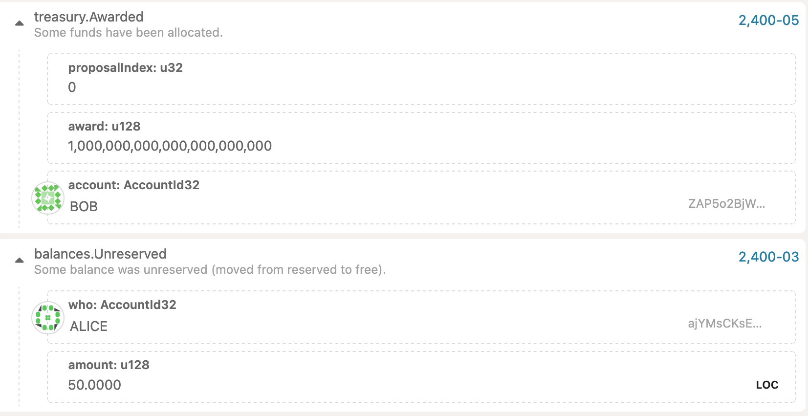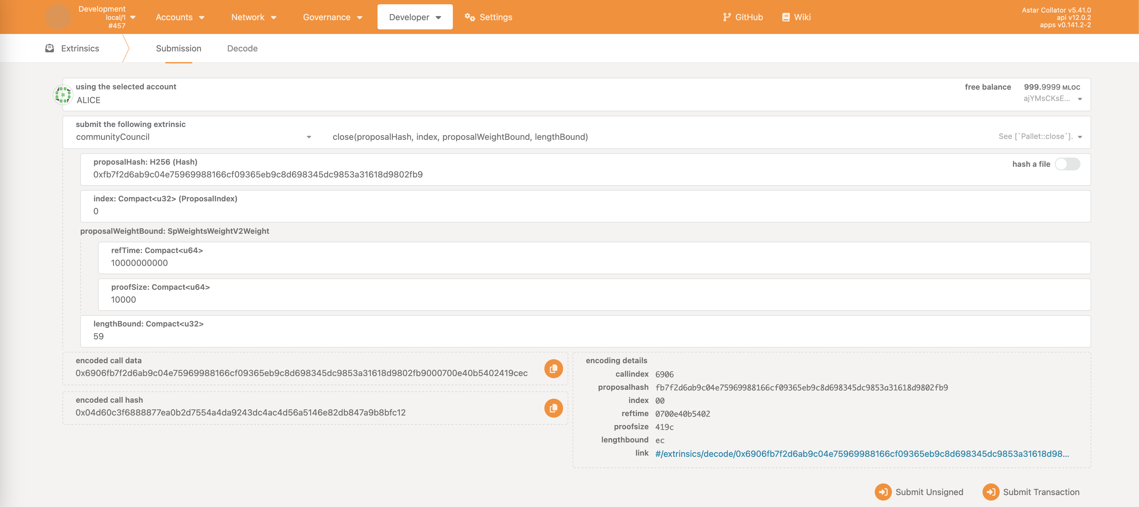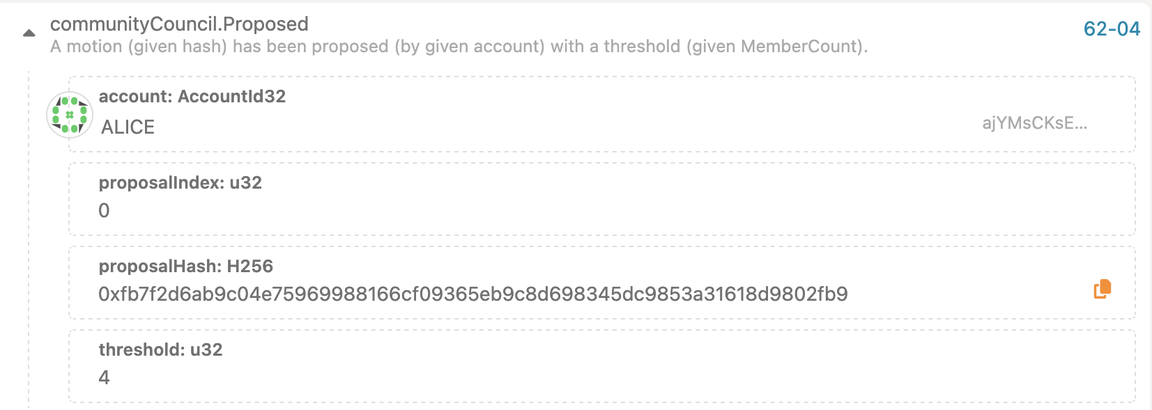 Once the proposal call is executed, user can observe the proposalHash and index. This can be used to vote & close the proposal as described in the first chapter.