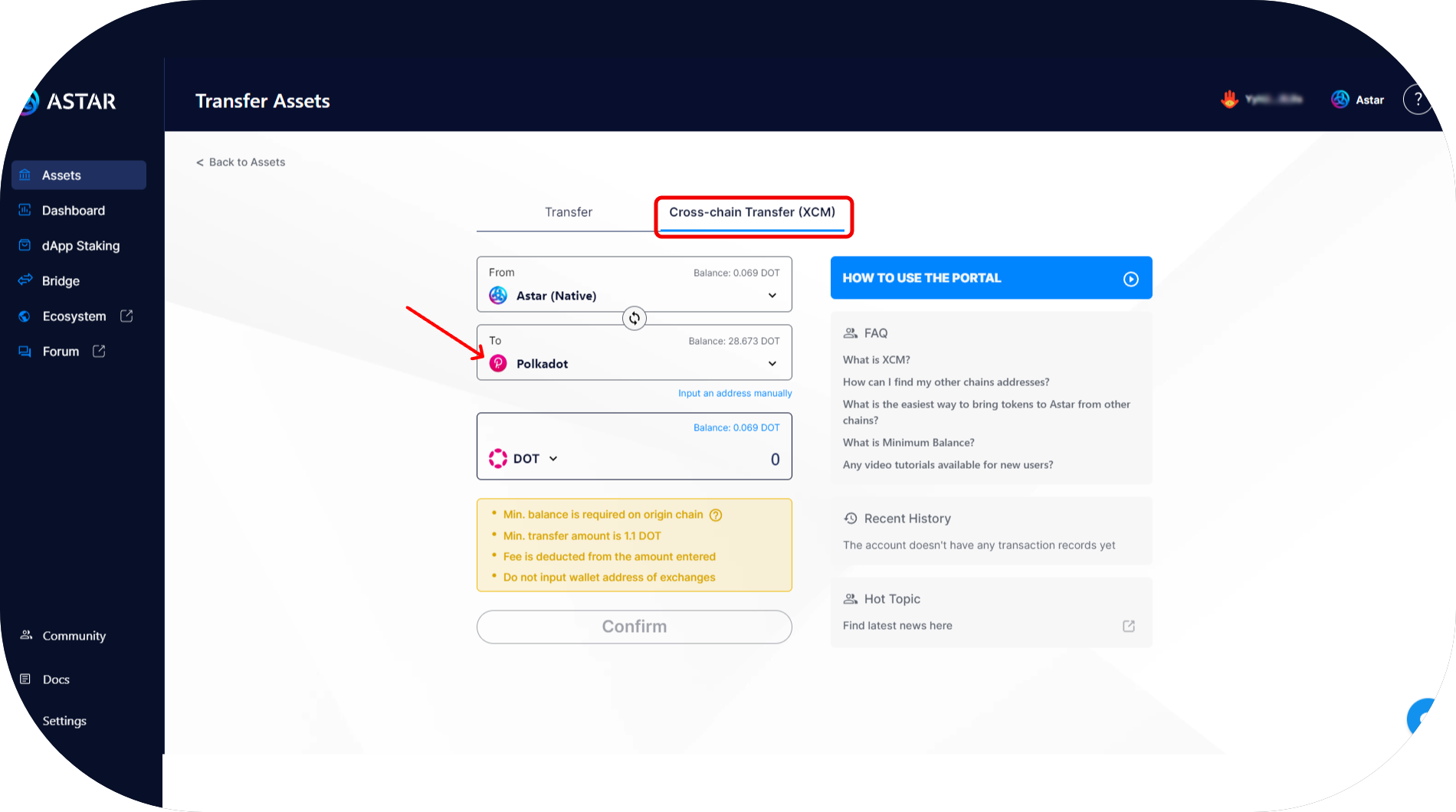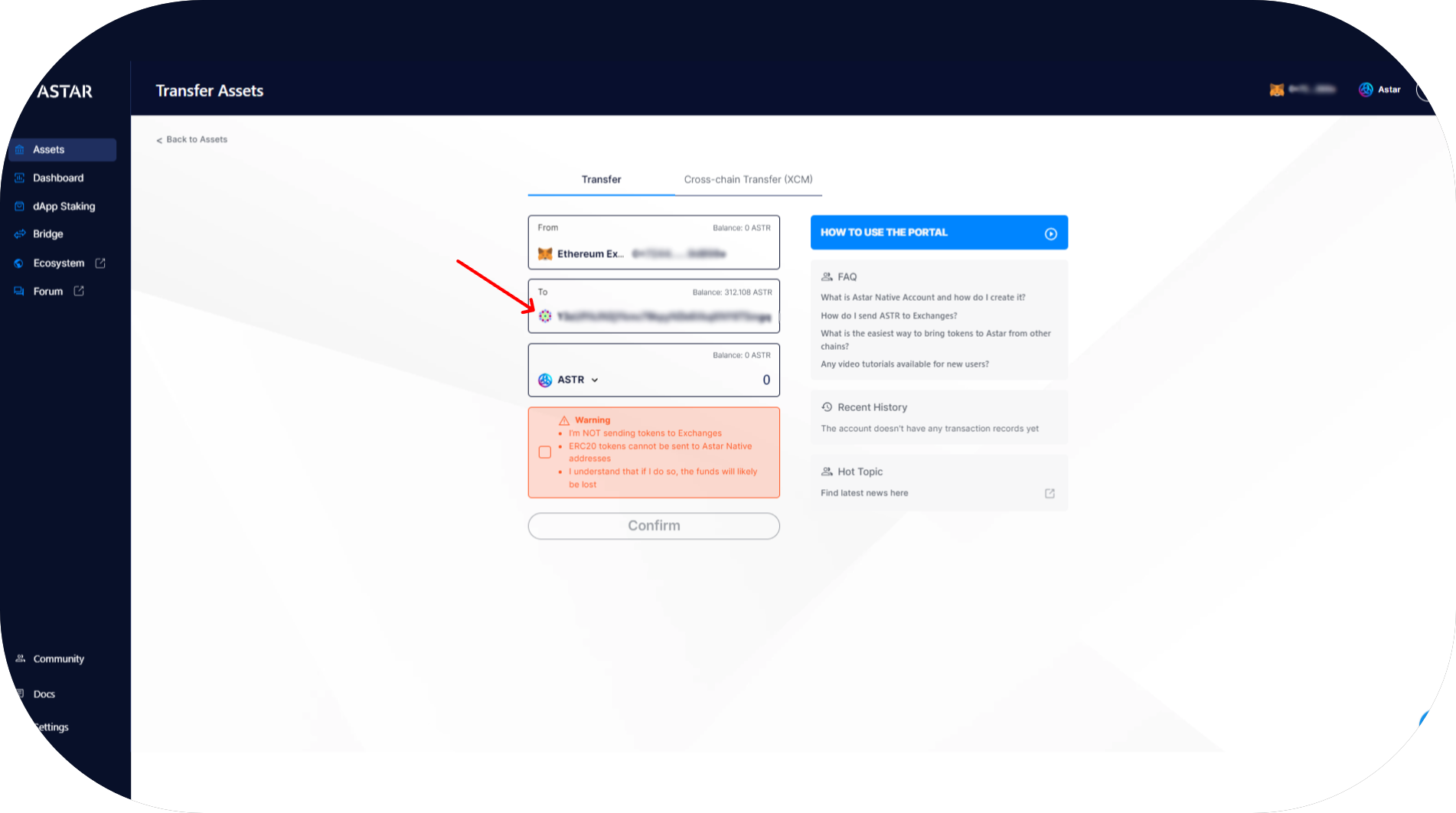 - You are now on the transfer page. Enter your Astar EVM address and the amount you want to transfer, then press